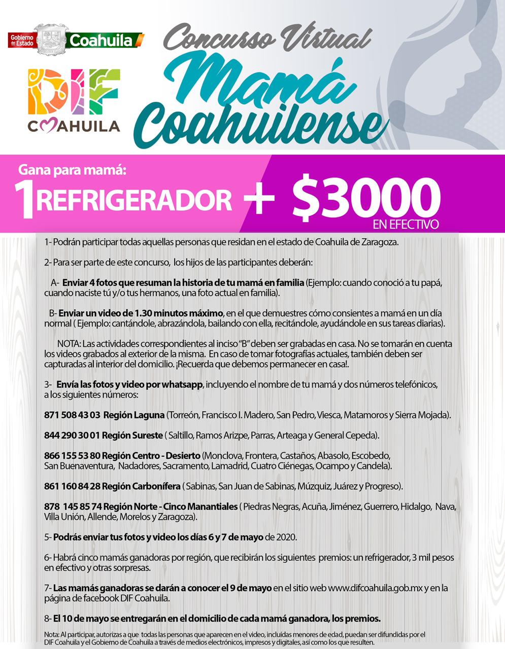 El video debe acompañarse con los datos completos de la mamá: nombre, edad y dos números de teléfono a donde se pueda comunicar personal del DIF Coahuila en caso de que resulte ganador.