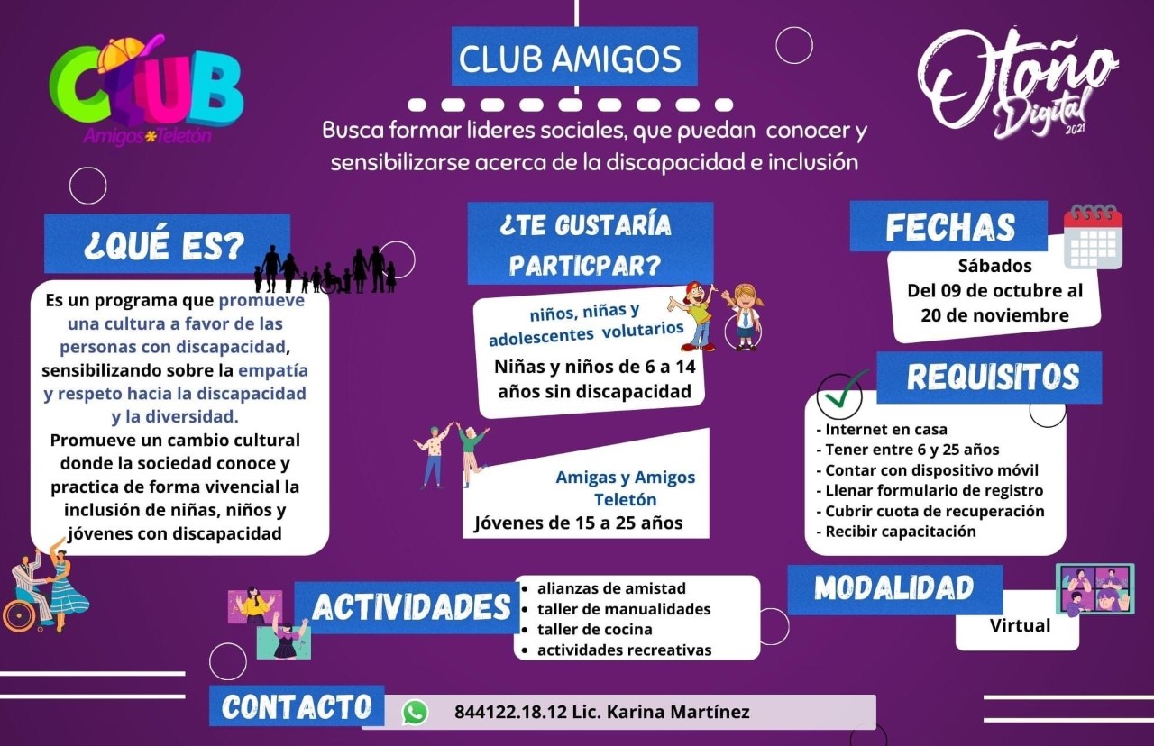 Karina Martínez Dávila y Gisela Martínez Rodríguez promotora y coordinadora respectivamente de Acción Voluntaria del Centro de Rehabilitación Infantil Teletón (CRIT) Coahuila informaron que a pesar de la pandemia, las actividades del Club Amigos Teletón permanece a distancia, por lo que extienden la invitación a niños y jóvenes entre los 6 a 25 años que deseen unirse como voluntarios a vivir la experiencia del Otoño Digital con la finalidad de promover una cultura a favor de las personas con alguna discapacidad, sensibilizando sobre la empatía y respeto hacia la discapacidad y la diversidad.