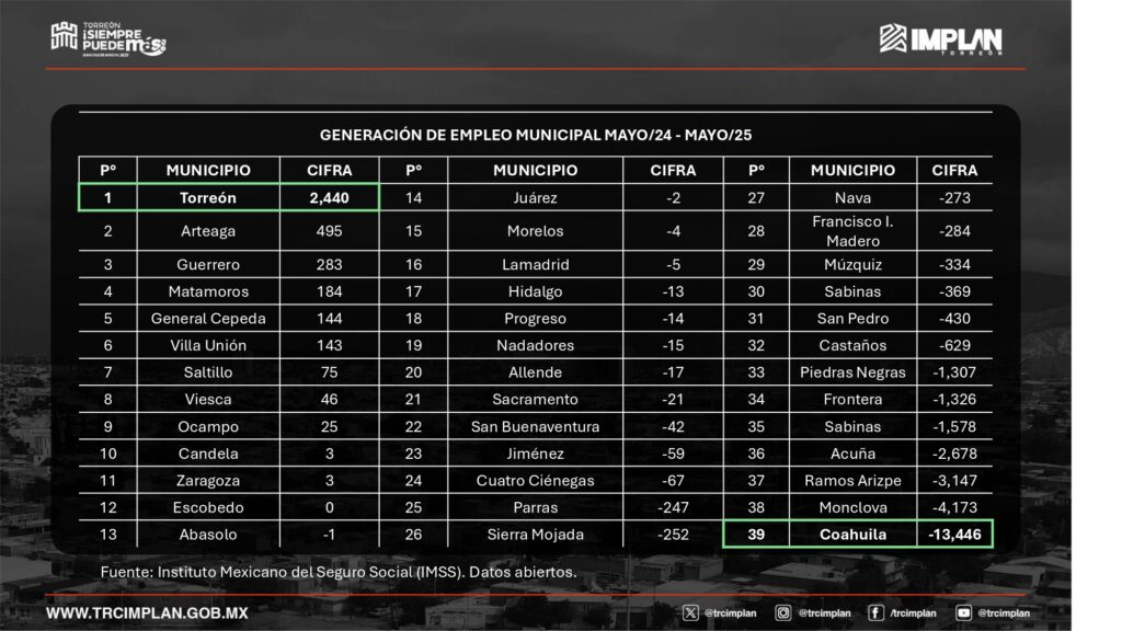 De tal forma que de Coahuila, Torreón es el municipio que mayor crecimiento muestra en oportunidades laborales y fuentes de empleo nuevas.