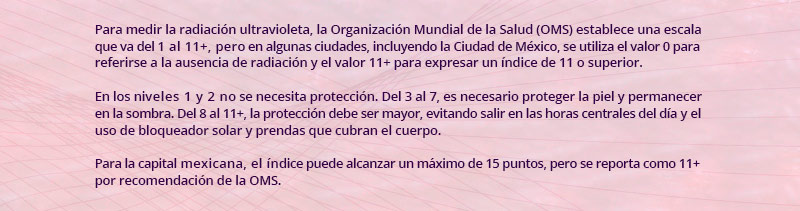 Asimismo, el investigador explicó que en el territorio mexicano la radiación ultravioleta ha llegado hasta el nivel 11+ del Índice UV, siendo esta extremadamente alta. Ante estos altos niveles, se recomienda evitar exponerse al sol durante los periodos en que la radiación es más alta (de 10:00 a 16:00 horas), permanecer en la sombra y no exponer la piel a la luz solar.