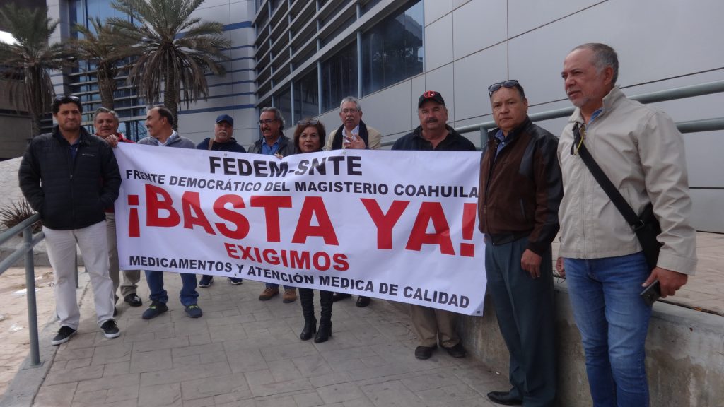 La mañana de este miércoles, maestros en activo y jubilados de las secciones 5, 35 y 38, integrantes del Frente Democrático del Magisterio (FEDEM), se manifestaron en la Clínica de Alta Especialidad del Instituto de Seguridad y Servicios Sociales de los Trabajadores del Estado (ISSSTE) en Saltillo, para denunciar el desabasto de medicamentos y atención oportuna por parte de esta institución.