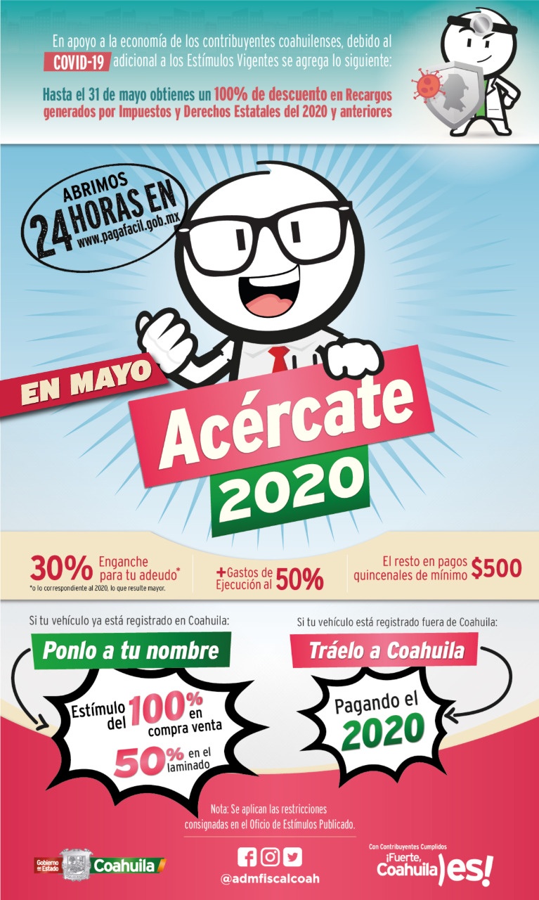 Díaz González añadió: “Debido a la contingencia del COVID-19, el Gobierno del Estado implementó en apoyo a la economía de los coahuilenses, adicional a los estímulos vigentes, se agrega hasta el 31 de mayo un 100 por ciento de descuento en Recargos generados por Impuestos y Derechos Estatales del 2020 y anteriores”.