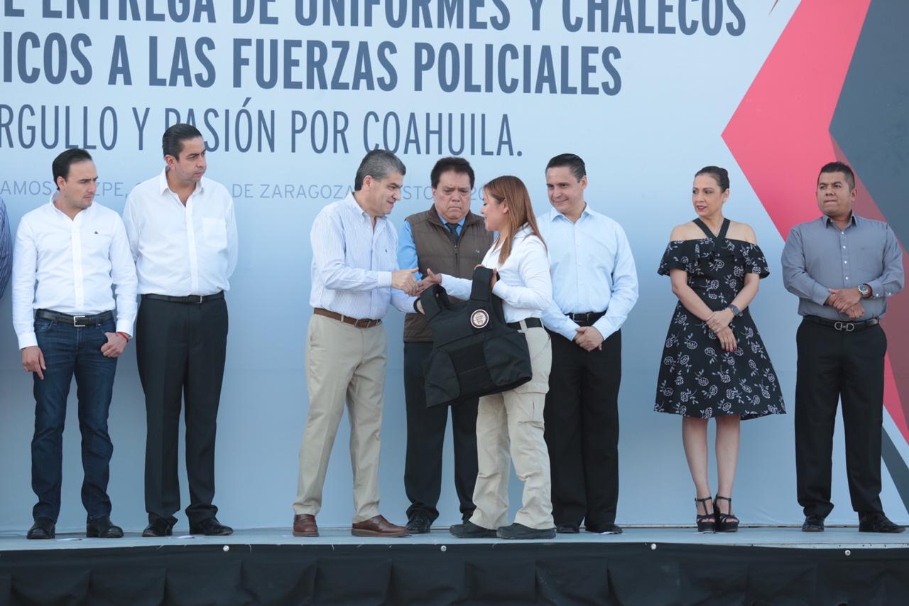 Ramos Arizpe.- En ceremonia que encabezó el gobernador Miguel Ángel Riquelme Solís, el Gobierno del Estado entregó uniformes y chalecos balísticos a las Fuerzas Policiales de Coahuila, en los que se invirtieron más de 25.5 millones de pesos.