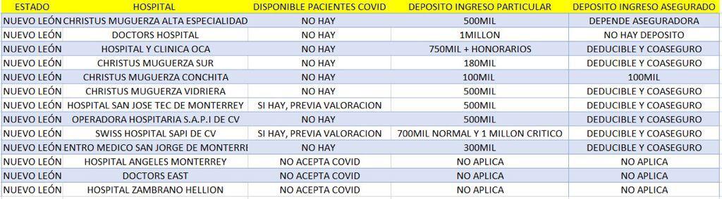 El más económico es el Christus Muguerza Conchita, que pide tan solo 100 mil pesos de depósito. El Christus Muguerza Sur solicita 180 mil, y el Christus Muguerza Vidriera 500 mil, misma cantidad que se pide en el Hospital San José y en el Christus Muguerza de Alta Especialidad, en tanto que el Hospital y Clínica Oca pide 750 mil más honorarios, el Swiss Hospital 700 mil para pacientes con un cuadro normal y 1 millón para los que llegan en estado crítico, y finalmente el Doctors Hospital dónde se solicita 1 millón de pesos como depósito.