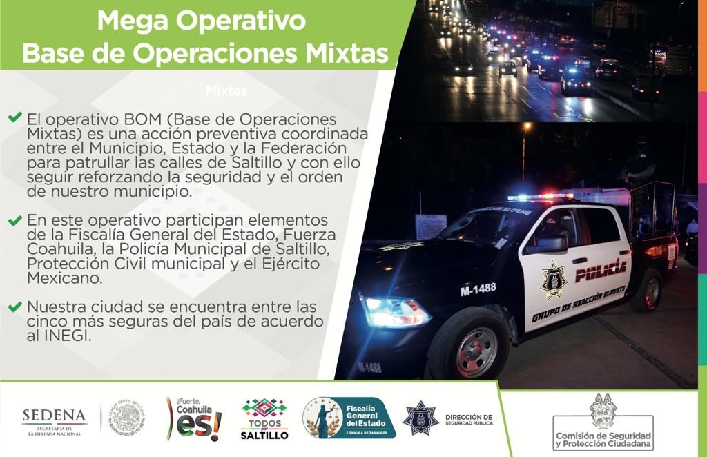 Al arrancar en la capital coahuilense la noche de este sábado el operativo denominado «Bom», en el que participaron diversas órdenes policiales con la intención de identificar y prevenir el delito, el Fiscal General de Coahuila, Gerardo Márquez Guevara, aseguró que acciones afines continuarán en temporada navideña y hasta cierre del presente año.