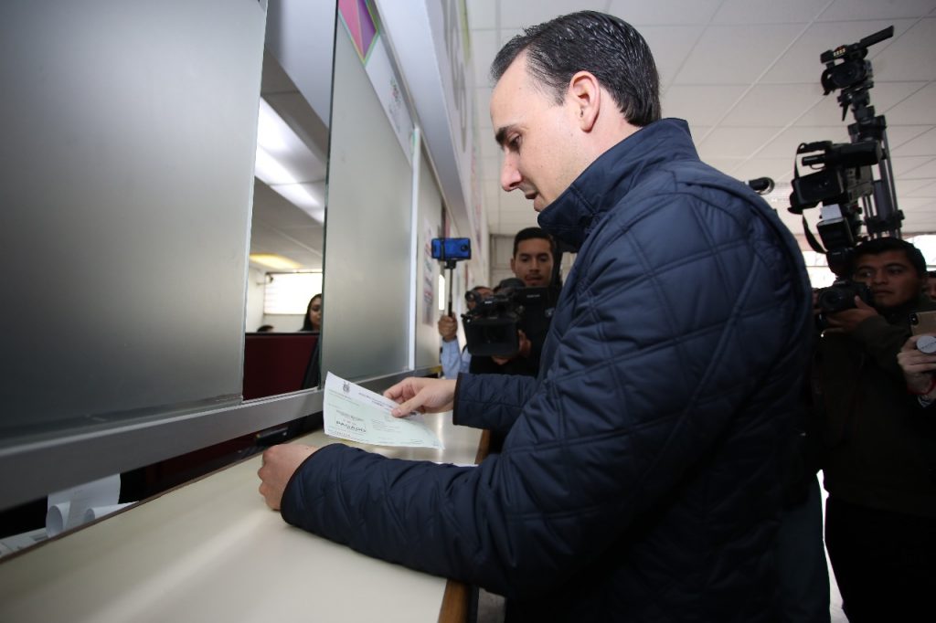 Manolo Jiménez Salinas realizó su pago en una de las cajas de la Presidencia Municipal de Saltillo, que estarán a disposición de la ciudadanía de lunes a viernes de 8:00 a 18:00 horas y sábado de 9:00 a 14:00 horas.