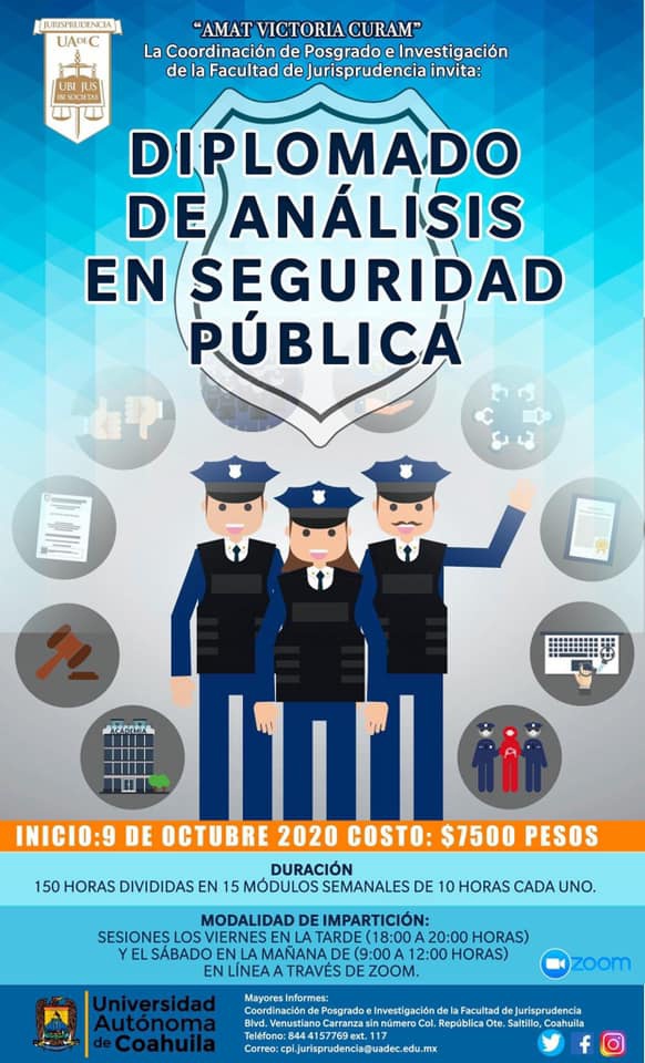 La Coordinación de Posgrado e Investigación de la Facultad de Jurisprudencia de la Universidad Autónoma de Coahuila, invita a cursar el Diplomado de Análisis en Seguridad Pública que iniciará el 9 de octubre de 2020.