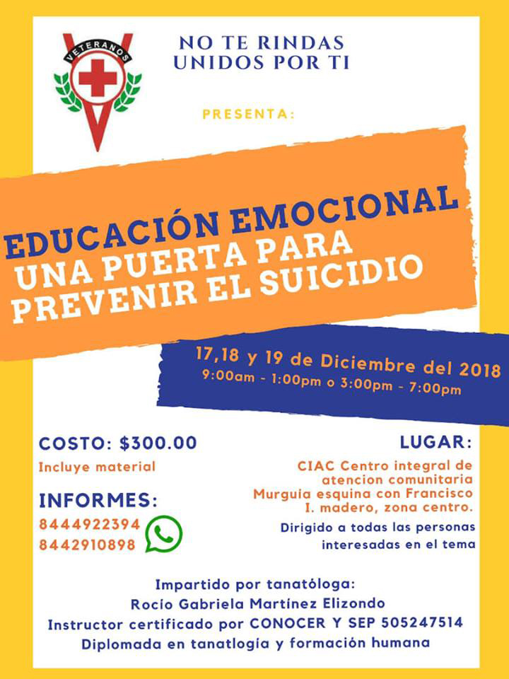“Educación Emocional: Una Puerta para Prevenir el Suicidio” es el nombre de la capacitación que será impartida por la especialista en Tanatología y Formación Humana Rocío Gabriela Martínez Elizondo.