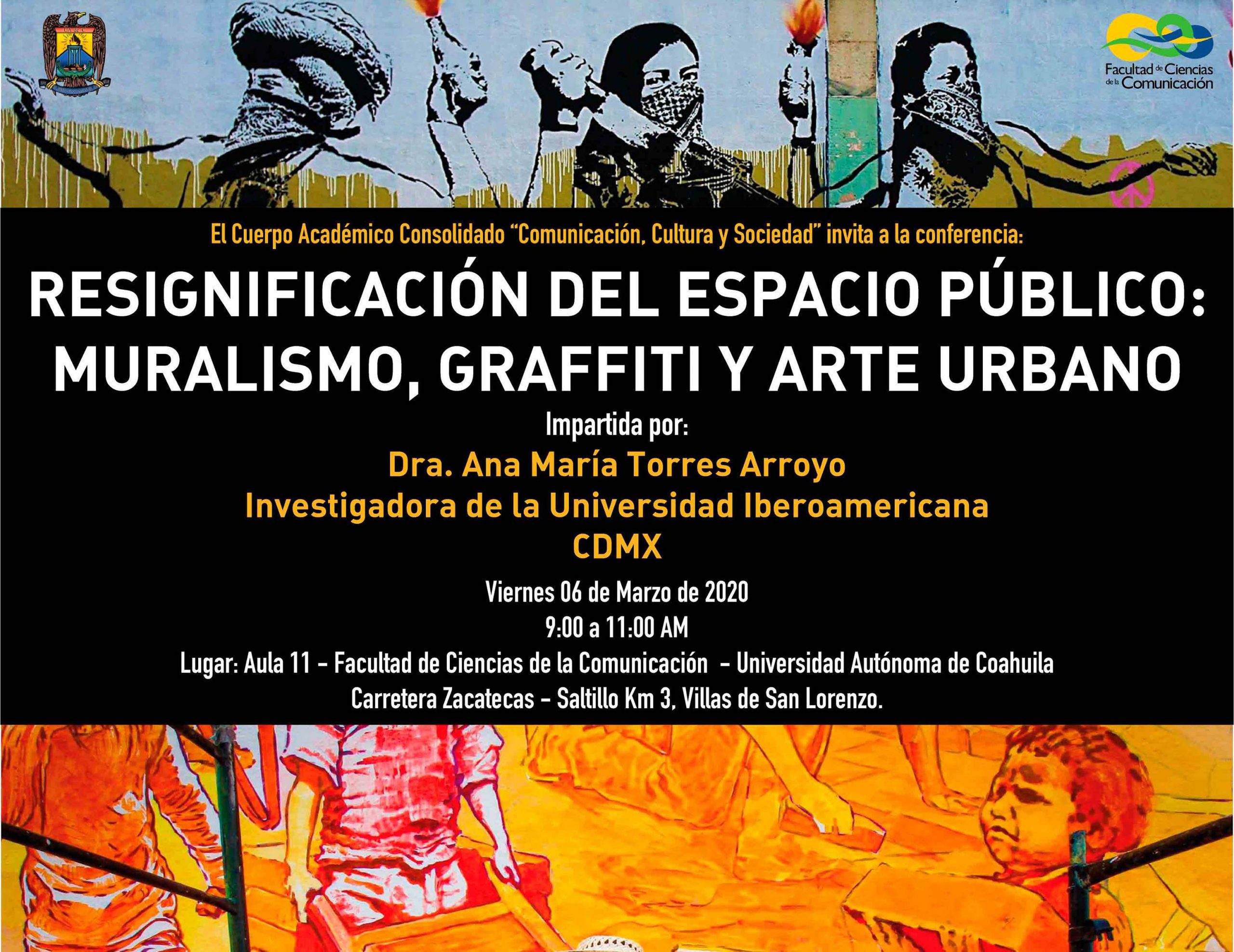 El Cuerpo Académico “Comunicación, Cultura y Sociedad” de la Facultad de Ciencias de la Comunicación de la Universidad Autónoma de Coahuila, convoca a la comunidad universitaria y al público en general a asistir a la conferencia “Resignificación del Espacio Público: Muralismo, Graffiti y Arte Urbano”.