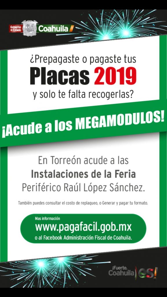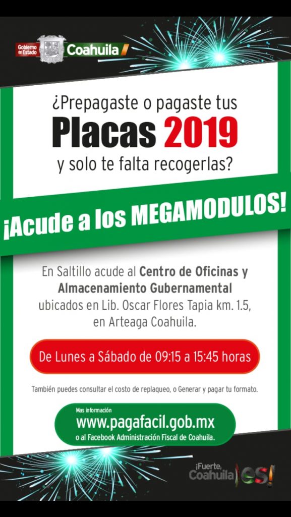 Los contribuyentes que aprovecharon el descuento que el Gobierno de Coahuila otorgó para el pago de los derechos de control vehicular, y que prepagaron o pagaron sus placas 2019, podrán recogerlas en los megamódulos instalados en el estado a partir de este miércoles 02 de enero y hasta el último día de marzo.