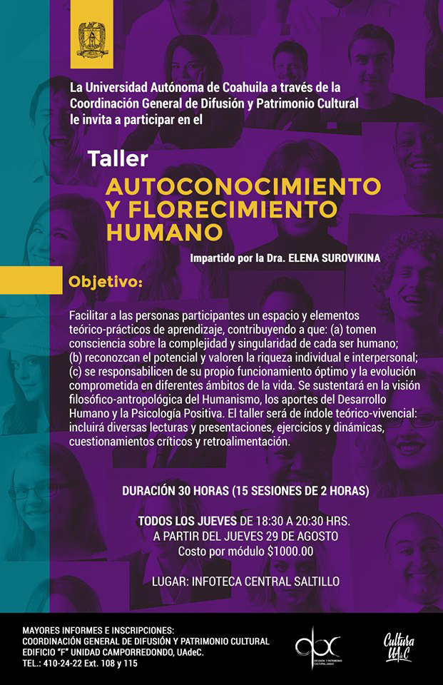 La Universidad Autónoma de Coahuila a través de la Coordinación General de Difusión y Patrimonio Cultural invita a participar en el taller “Autoconocimiento y Florecimiento Humano”.