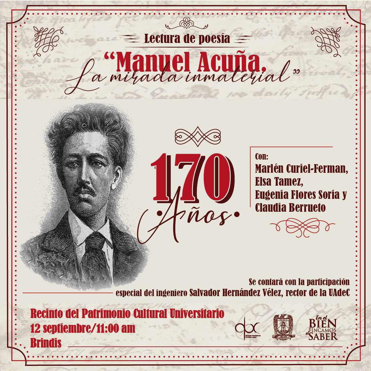 Durante el homenaje al ilustre saltillense, que lleva por nombre “Manuel Acuña, la mirada inmaterial”, participará el rector de la UA de C, Salvador Hernández Vélez, así como Marlén Curiel-Ferman, Elsa Tamez, Eugenia Flores Soria y Claudia Berrueto.
