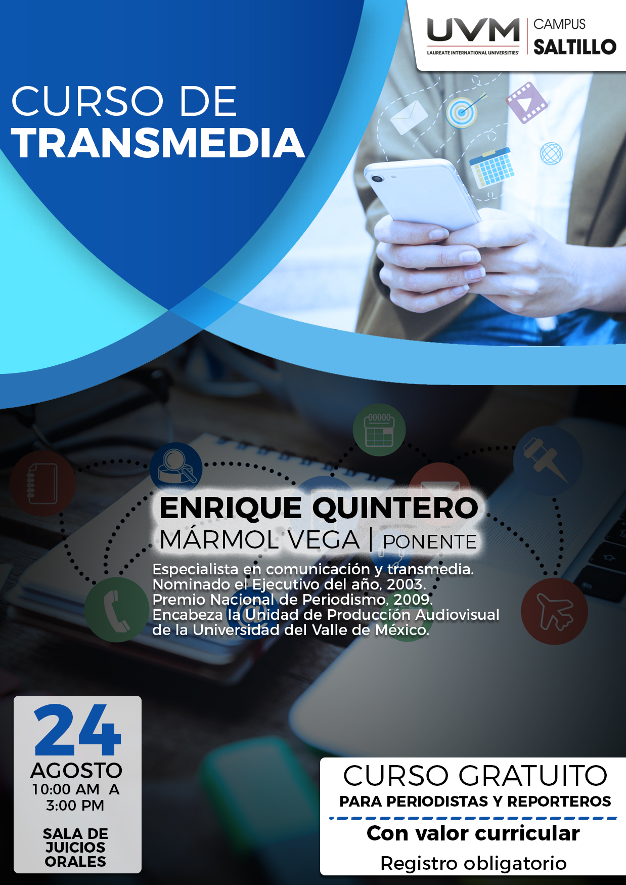 Este próximo 24 de agosto a partir de las 10:00 de la mañana, el comunicador nacional Enrique Quintero Mármol Vega, visitará la Sala de Juicios Orales de la Universidad Valle de México Campus Saltillo (UVM), ubicada en Calle Tezcatlipoca 2301, para impartir su Curso de Transmedia, encaminado, según información de Mayela Araceli Maldonado, del Departamento de Experiencia Estudiantil, a que los profesionales y prospectos de la comunicación como periodistas y reporteros, se actualicen en relación de la nuevas tecnologías y formatos de transmisión de información.