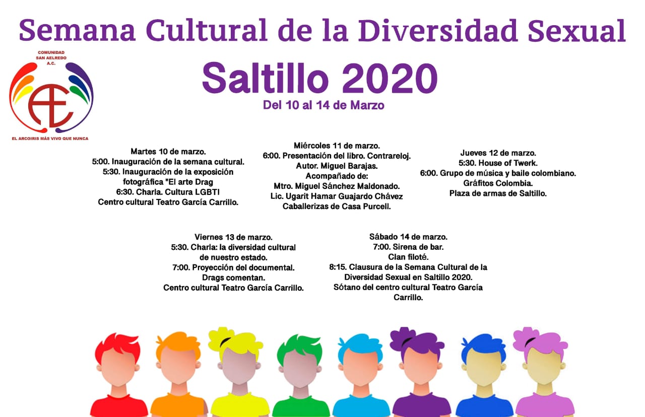 Del 10 al 14 de marzo, la Comunidad San Aelredo Asociación Civil llevará a cabo la novena edición de la «Semana Cultural de la Diversidad Sexual Saltillo 2020», que incluirá exposiciones, charlas, presentación de libro, música en vivo y teatro, en sus diversas sedes.
