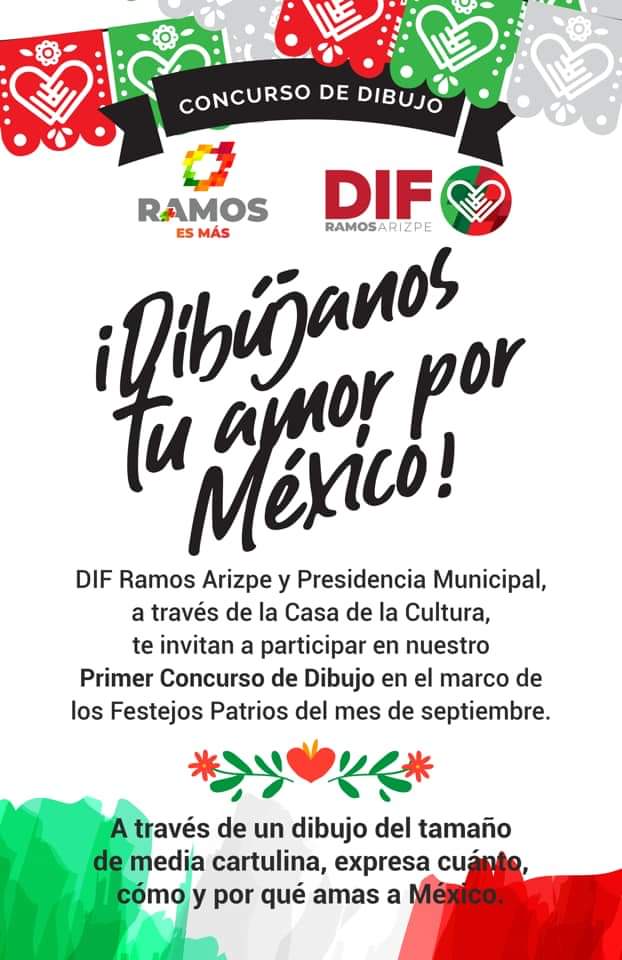 En el marco de los festejos patrios del mes de septiembre, el DIF Ramos Arizpe y la Presidencia Municipal a través de la Casa de la Cultura, invitan a niños, jóvenes y adultos a participar en el primer Concurso de Dibujo “¡Dibújanos tu amor por México!”, en el que se deberá plasmar cuánto, cómo y por qué amas a México.