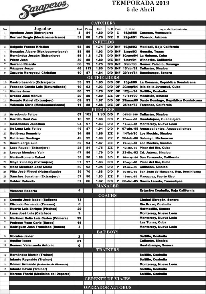 Los Saraperos de Saltillo se declaran listos con sus 30 jugadores para arrancar la temporada 2019 de la Liga Mexicana de Béisbol, una gran expectativa pues estrenan directiva cien por ciento Saltillense y manager en la persona de Roberto “Chapo” Vizcarra, que busca regresar a los primeros planos al equipo y aspirar a los play off para contender por el Campeonato.