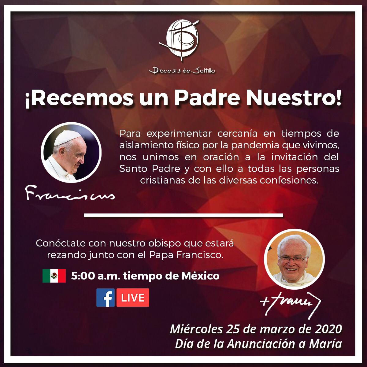 Asimismo, se extendió un llamado a que los interesados se unan al obispo Raúl Vera López, quien «estará rezando junto con el Papa Francisco», por medio de una transmisión en vivo a través del Facebook de la Diócesis de Saltillo, a las 5:00 de la mañana del día mencionado.