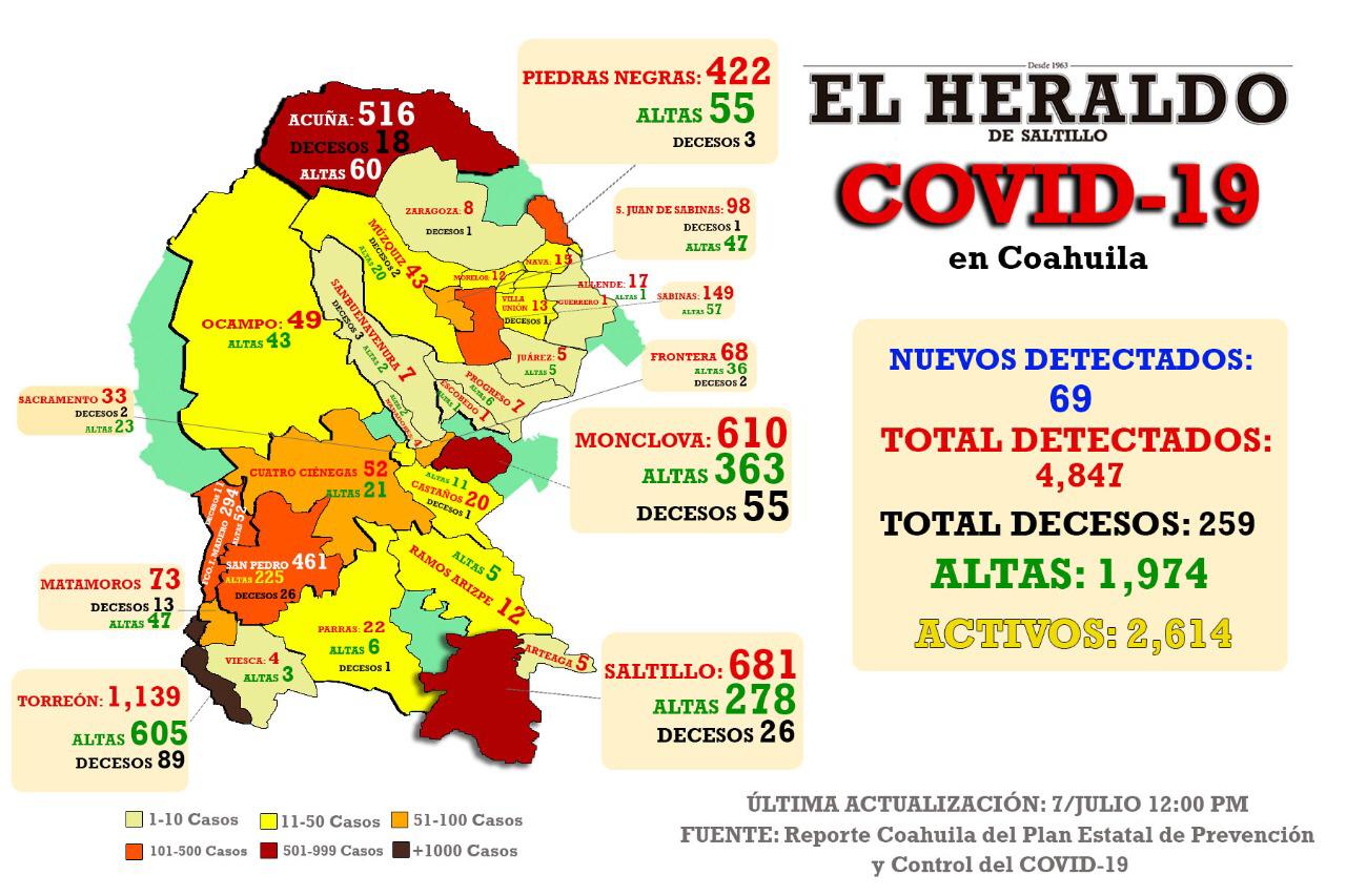 Se contabilizan en Coahuila en total 4 mil 847 casos -incluidos 259 decesos- distribuidos de la siguiente manera: