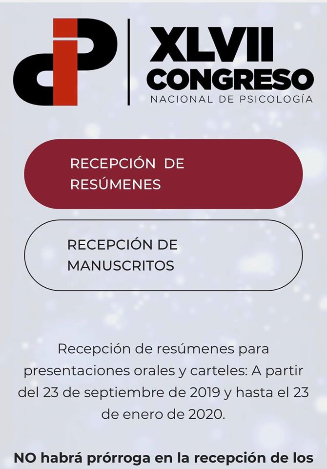 Los estudiantes, profesores, investigadores y personas interesadas en la psicología que deseen participar en el XLVII Congreso Nacional de Psicología: “Perspectivas de la Psicología en Iberoamérica: Ciencia y Estudio” y en el 12 Congreso Iberoamericano de Psicología de la Federación Iberoamericana de Agrupaciones y Colegios de Psicología tienen hasta el 23 de enero de 2020 para entregar sus resúmenes y formar parte de los ponentes.
