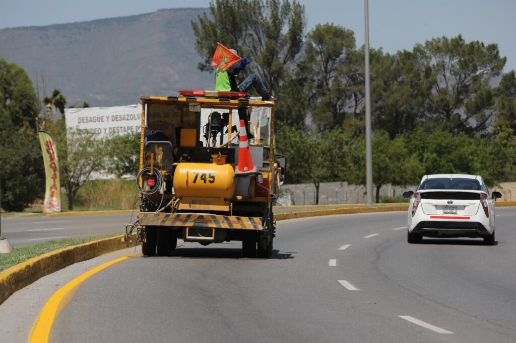 Para mejorar la seguridad vial, al sur de Saltillo, cuadrillas trabajaron en la delimitación de carriles viales con pintura amarilla sobre el bulevar Emilio Arizpe de la Maza.