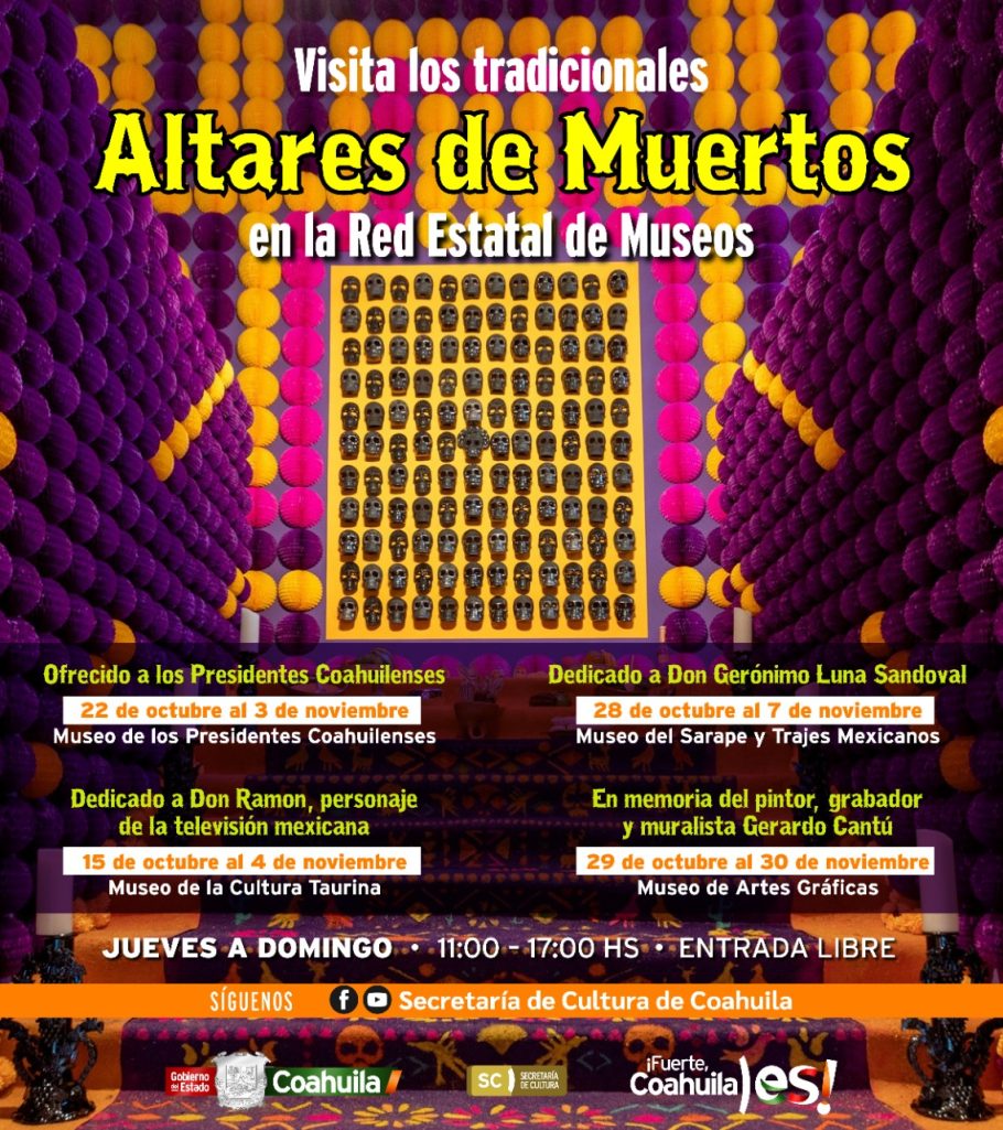 La Secretaría de Cultura coahuilense (SC) invita a visitar los altares de muertos instalados en la Red Estatal de distintos Museos, particularmente de la capital coahuilense.