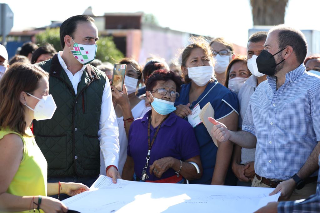 “Durante la mañana anduvimos en las colonias Ignacio Zaragoza, Monte del Sinaí y Valle de las Aves supervisando construcción de plazas, pavimento y un puente vehicular. Seguimos pa’ delante cumpliendo con nuestra gente”, señaló Manolo Jiménez.