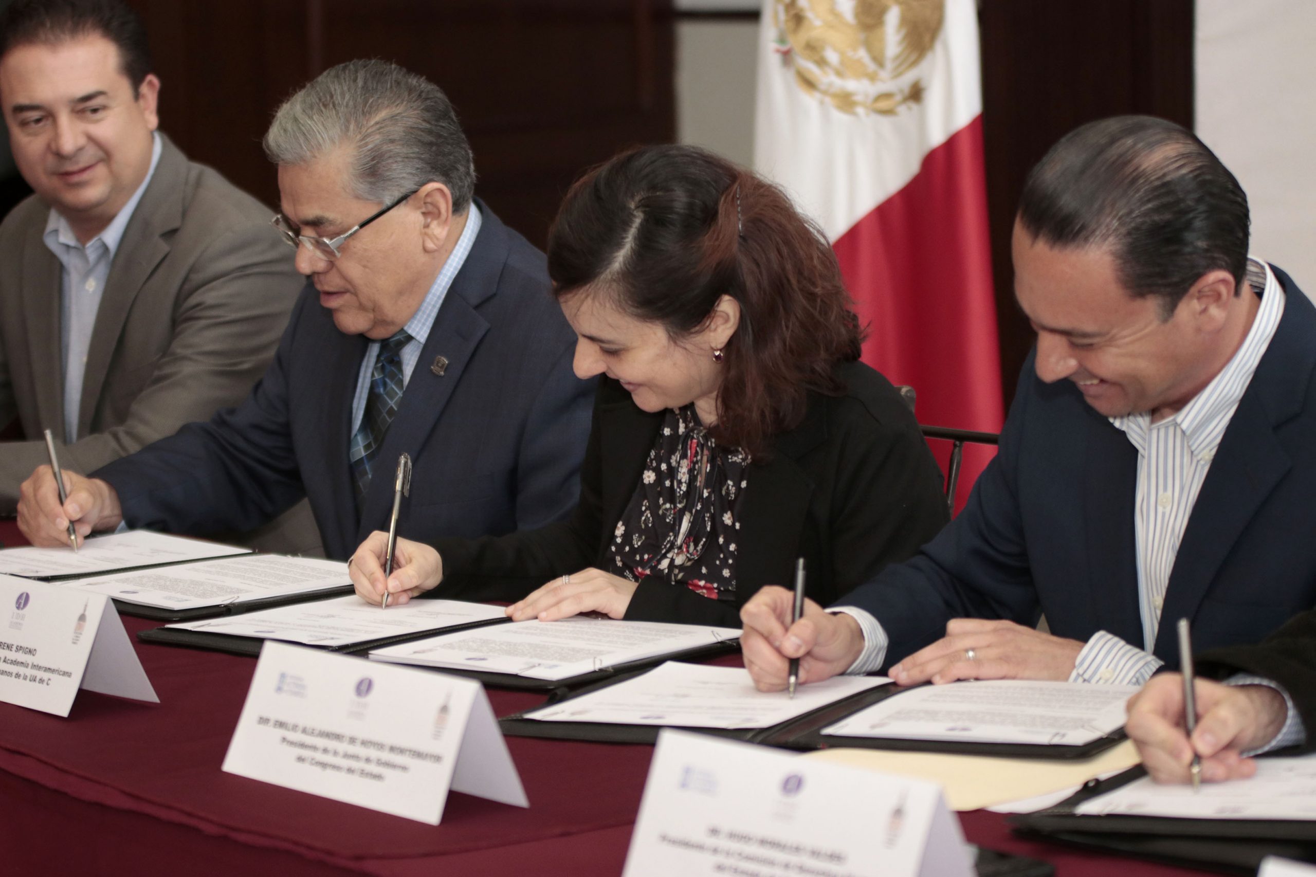 Signaron el documento, el rector de UA de C, Salvador Hernández Vélez, la directora de la Academia Interamericana de Derechos Humanos, Irene Spigno, el presidente de la Junta de Gobierno del Congreso del Estado, el diputado Emilio Alejandro de Hoyos Montemayor y el presidente de la Comisión de Derechos Humanos de Coahuila, Hugo Morales Valdés.
