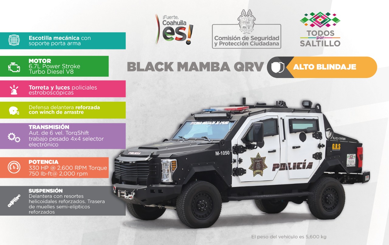 Trabajando en conjunto con el Gobierno del Estado, hoy Saltillo cuenta con dos nuevas unidades tácticas blindadas, denominadas “Black Mamba”, así como con el doble de patrullas de las que había en la ciudad en 2017.