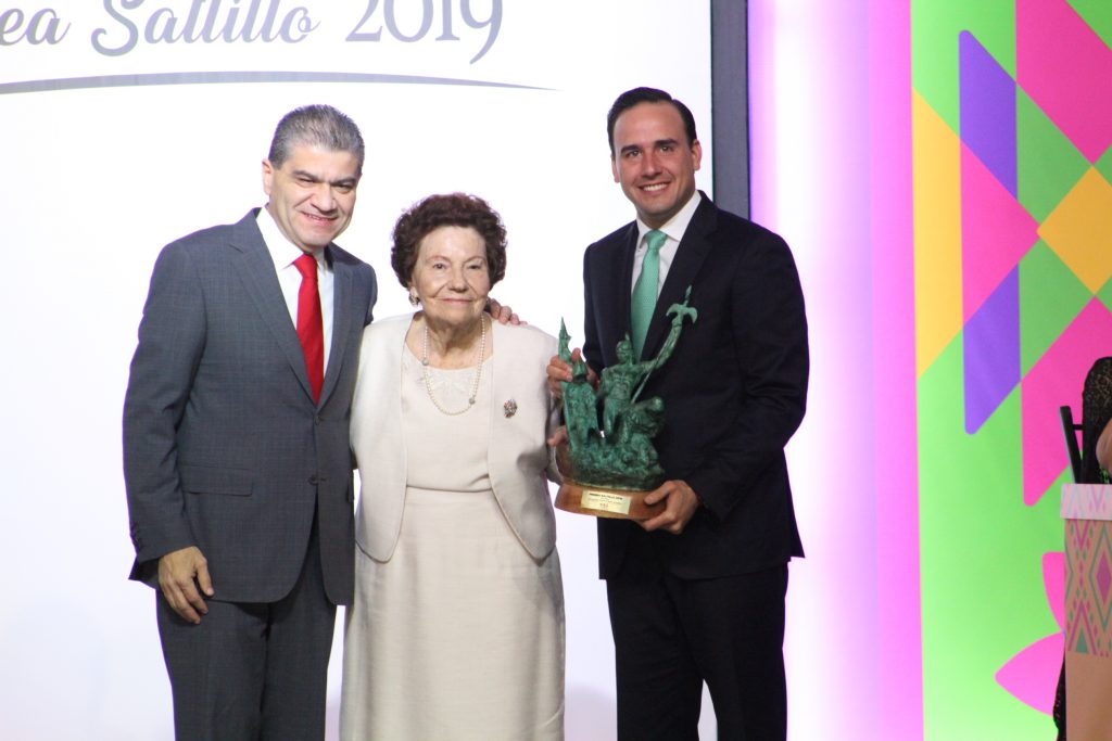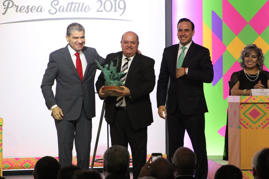 Junto con el mandatario estatal, el Alcalde hizo entrega de la Presea Saltillo 2019 a la señora Concepción Angélica Narro González, así como a la Benemérita Escuela Normal de Coahuila, y al fundador del periódico EL HERALDO DE SALTILLO, don Roberto Orozco Melo, en la categoría post mortem.