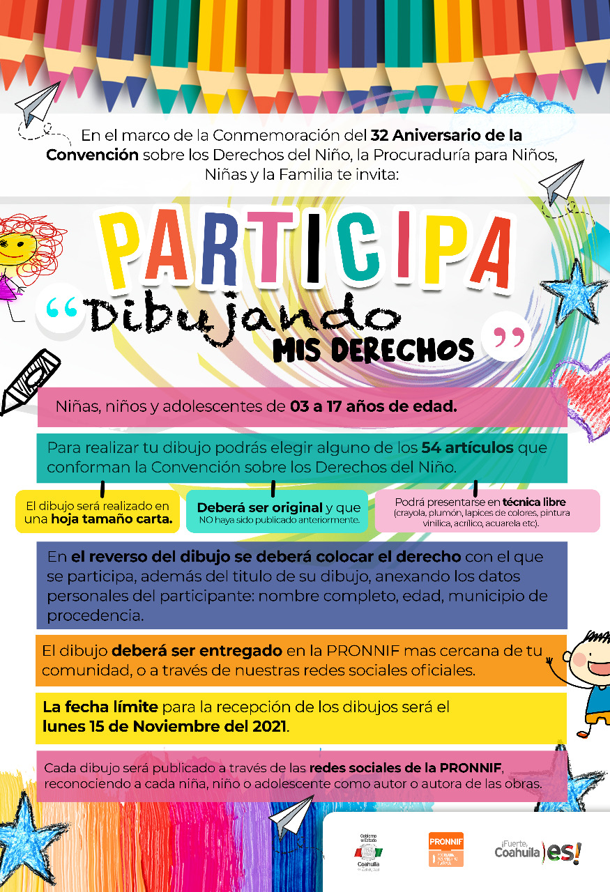 En el marco de la Conmemoración del 32 Aniversario de la Convención sobre los Derechos del Niño, la Procuraduría para Niños, Niñas y la Familia de Coahuila (PRONNIF) invita a niñas, niños y adolescentes de entre 3 y 17 años a participar en “Dibujando mis Derechos”.
