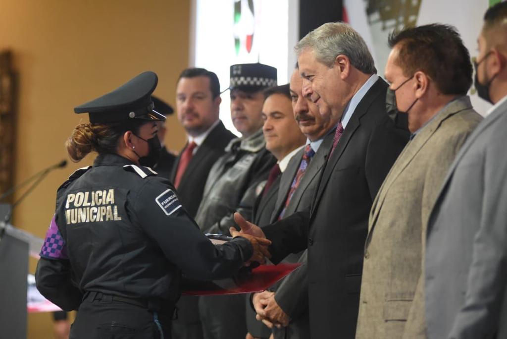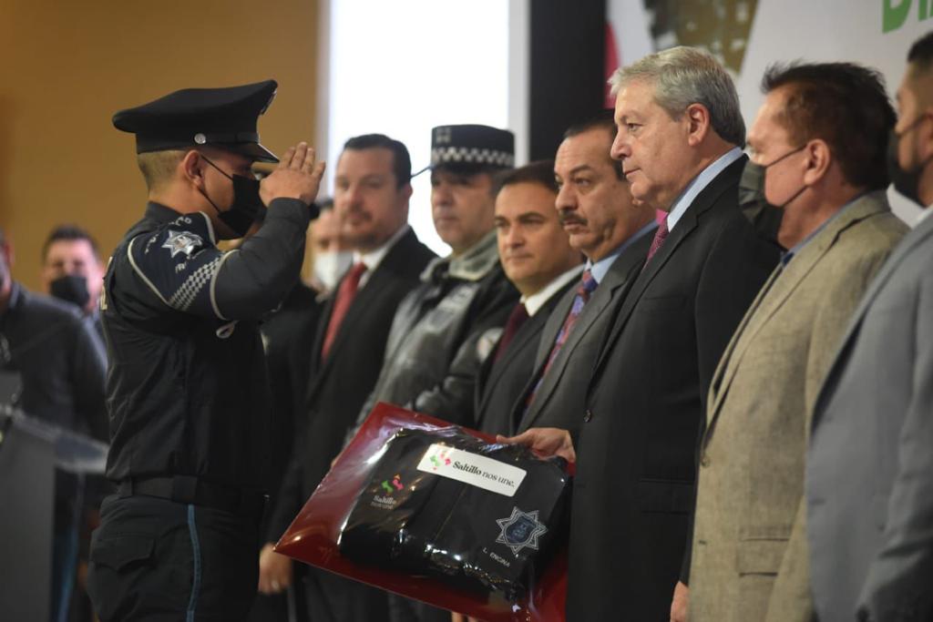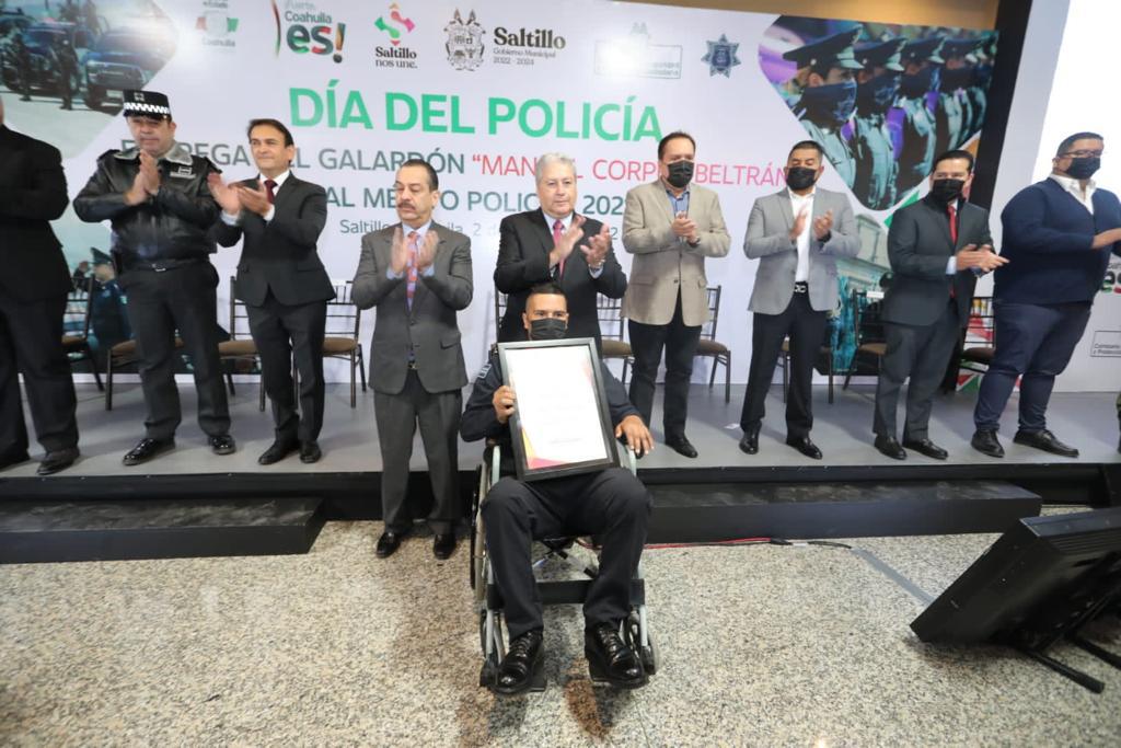 Como parte de los festejos por el Día del Policía, el alcalde de Saltillo, José María Fraustro Siller, entregó el Galardón al Mérito Policial Manuel Corpus Beltrán al oficial Juan Carlos Soto Sandoval.