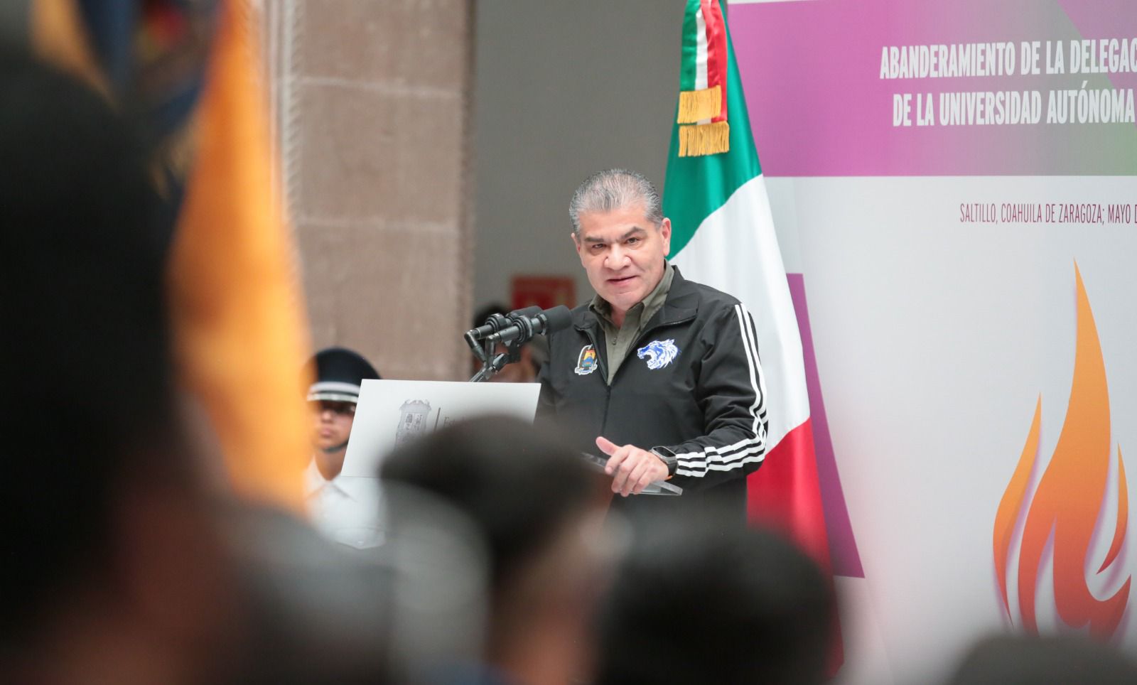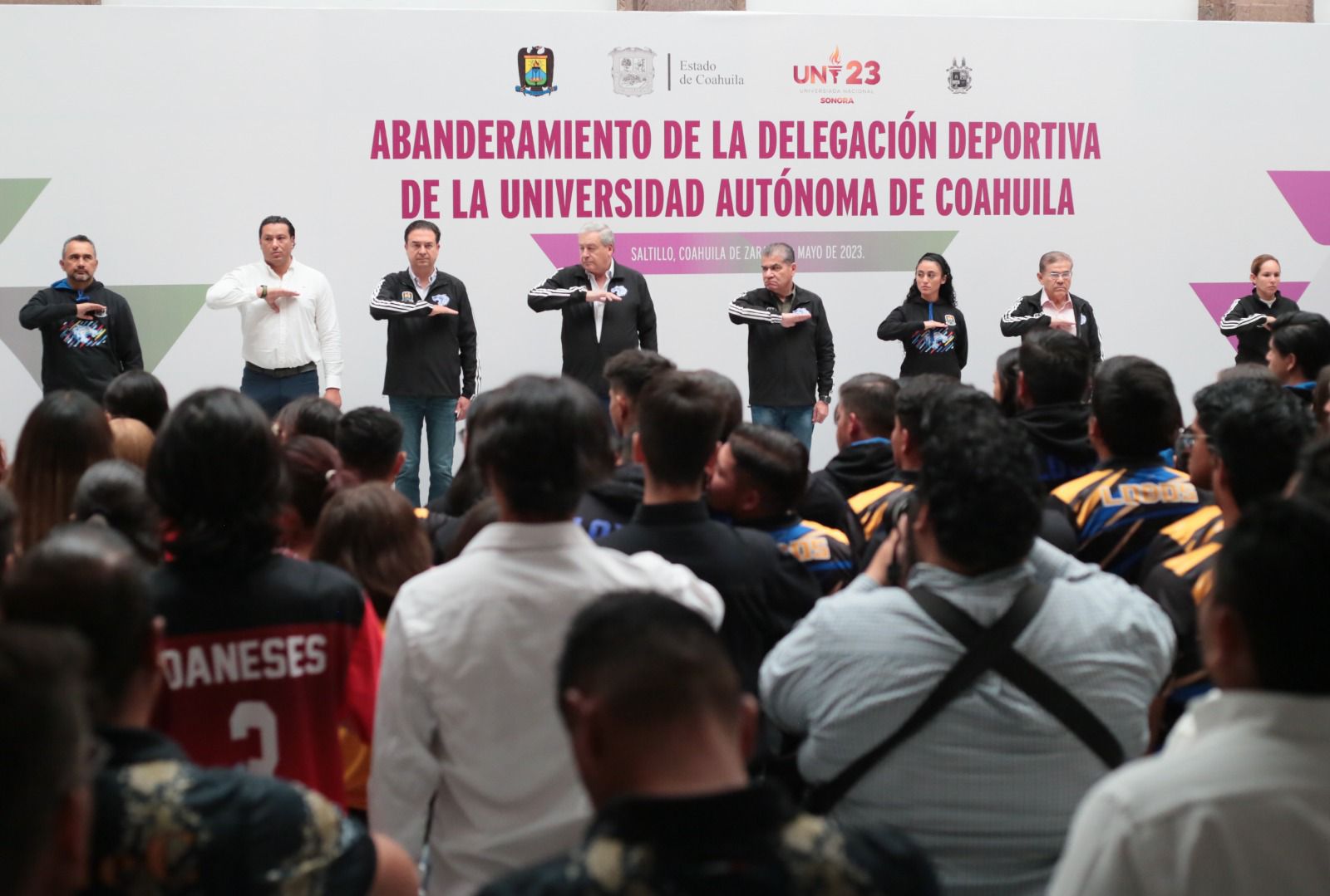 El gobernador Miguel Ángel Riquelme Solís, acompañado por el rector Salvador Hernández Vélez, abanderó a la delegación de atletas de la Universidad Autónoma de Coahuila que participará en la Universiada 2023, con sede en Sonora, evento que se llevó a cabo en Palacio de Gobierno.